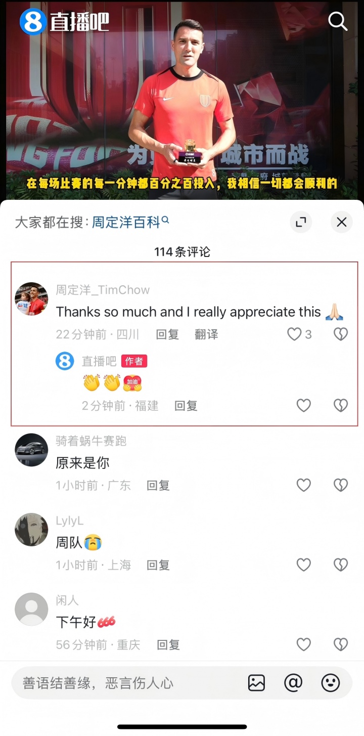 2025-10-17 16:00:26当选直播吧中超最佳&收到个人海报,周定洋社媒评论:非常感谢